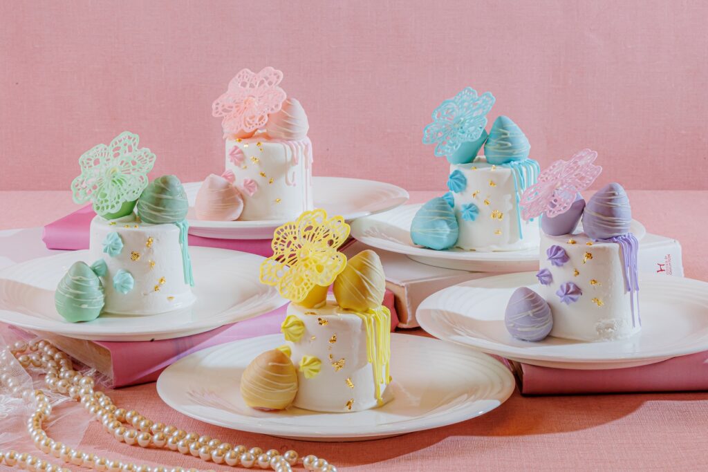 フレッシュいちごのチョコレートディップやお花のチュイール、マシュマロなどの可愛らしいトッピングを施した5色 (ピンク、ライトブルー、イエロー、ピスタチオグリーン、ラベンダー)から選べるショートケーキ付きのアフタヌーンティー。