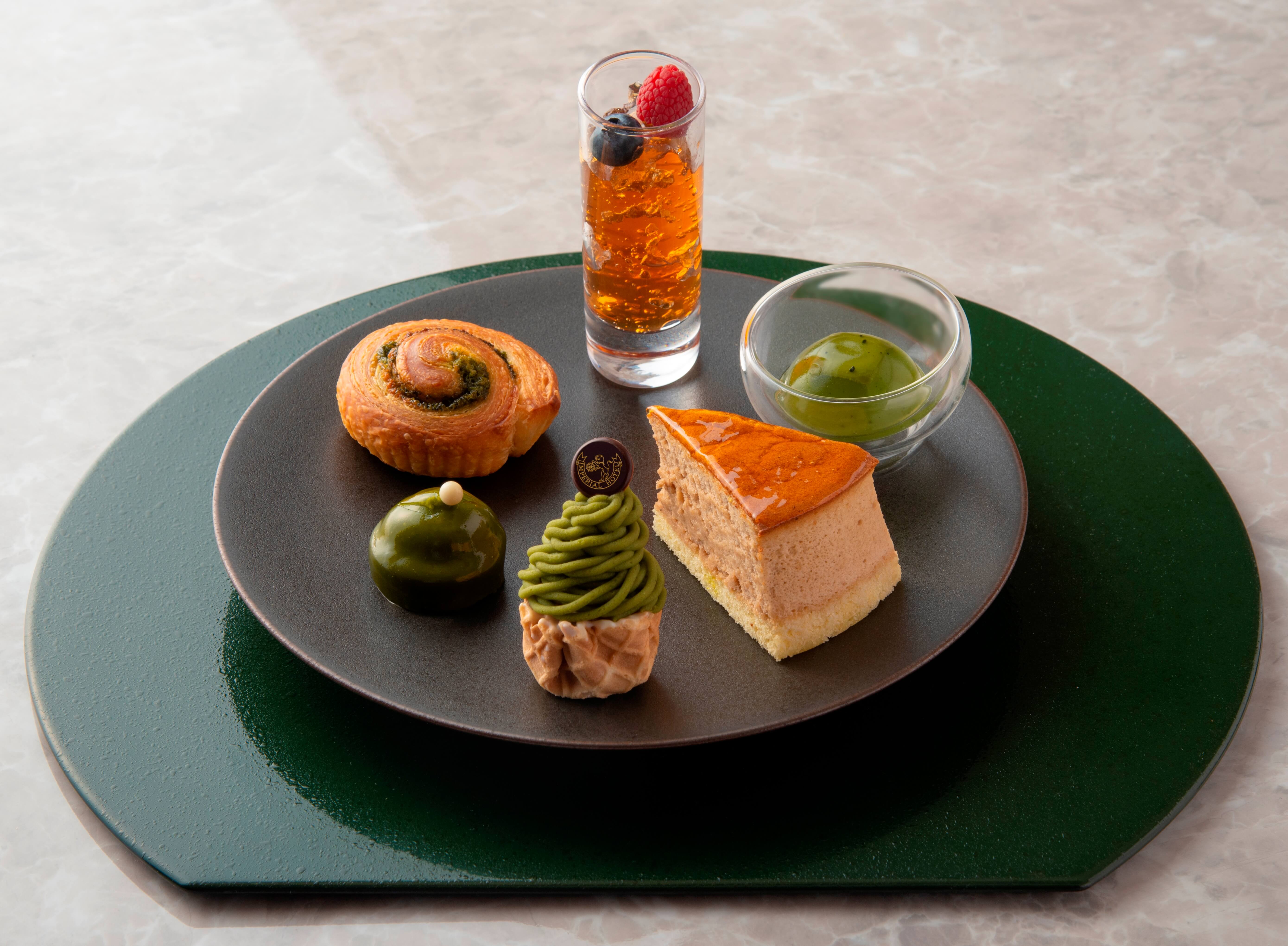 抹茶ミルフィーユ、抹茶フィナンシェ、ほうじ茶シャンティイタルト、ほうじ茶香るチョコレートムース、