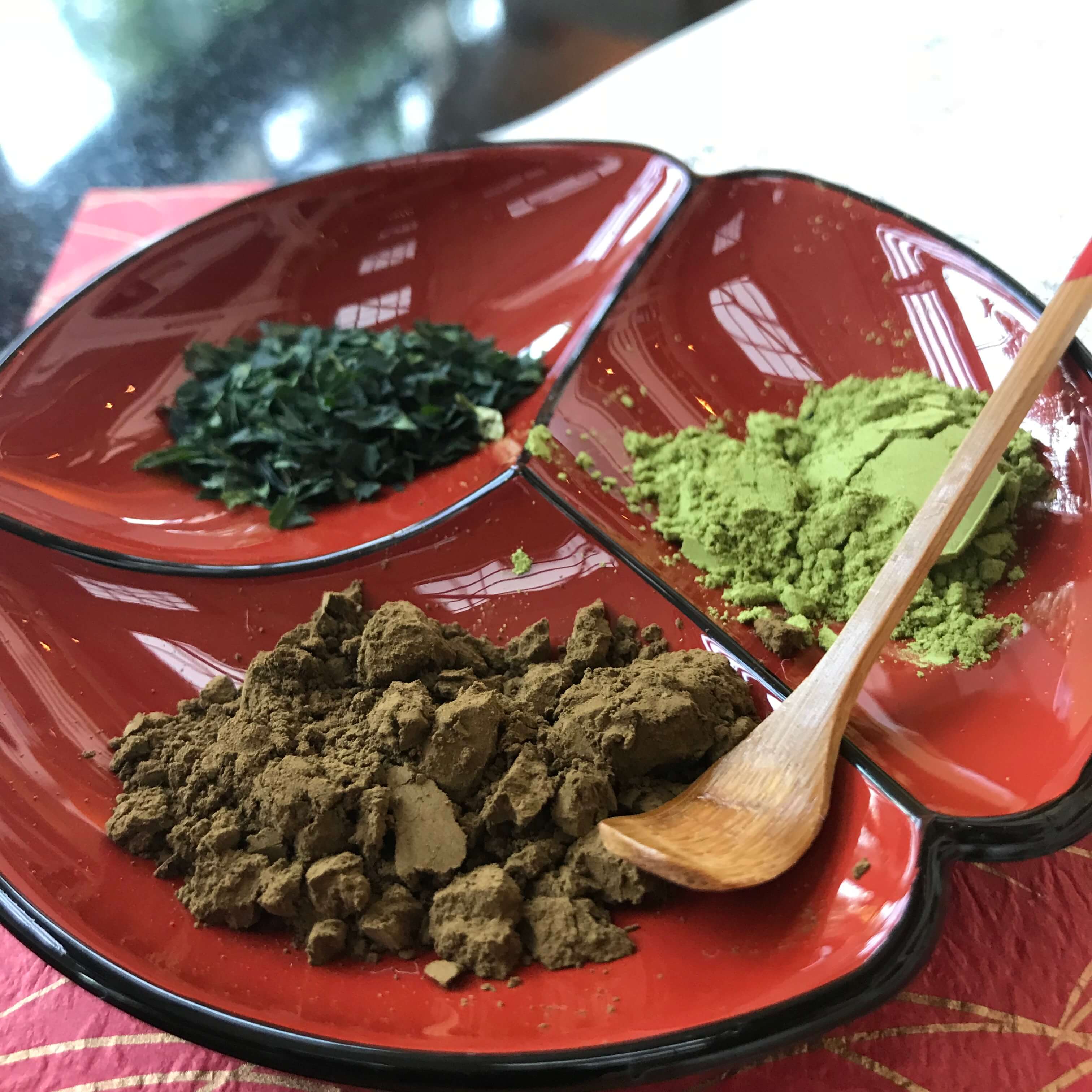 抹茶、茶葉、もなか、おいり、黒蜜、きなこ、あんこ、白玉、昆布、岩塩、バルサミコ酢、