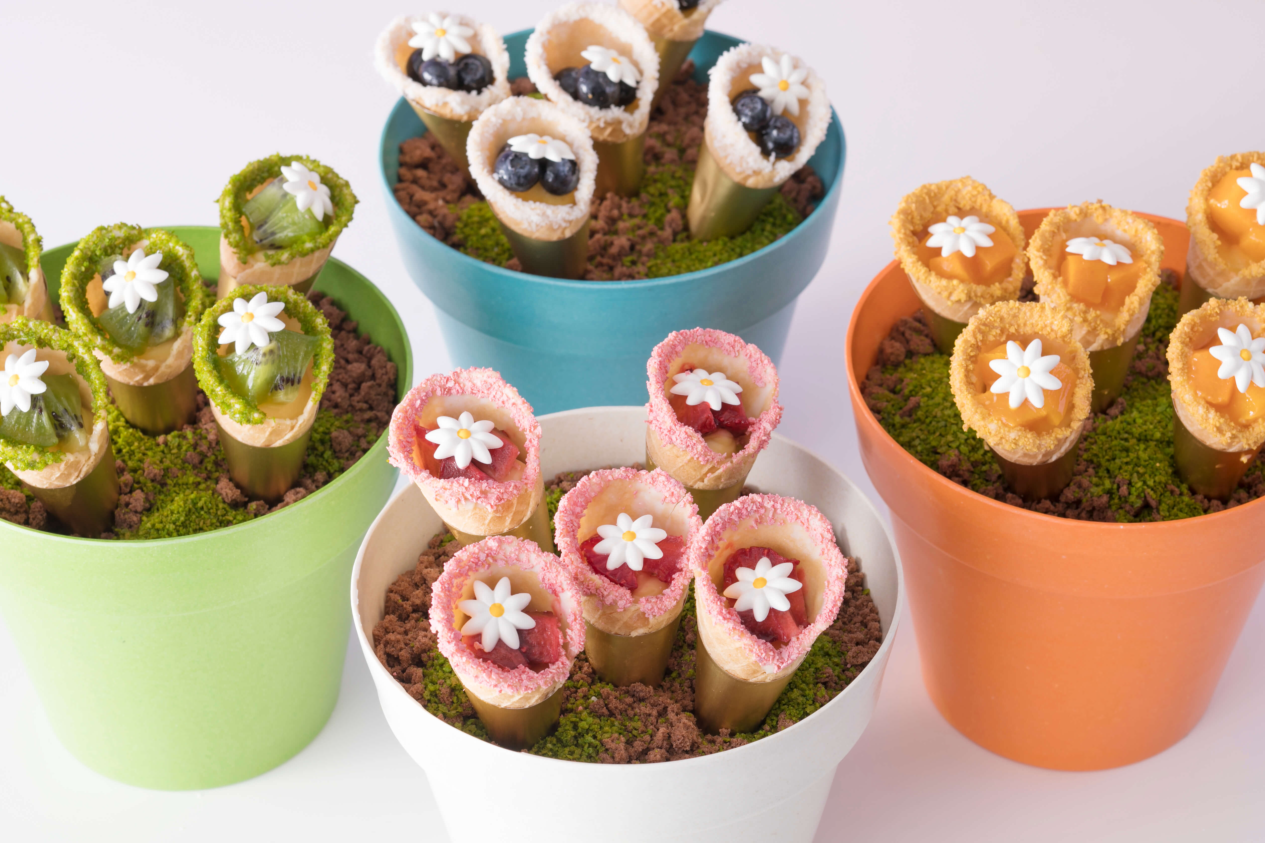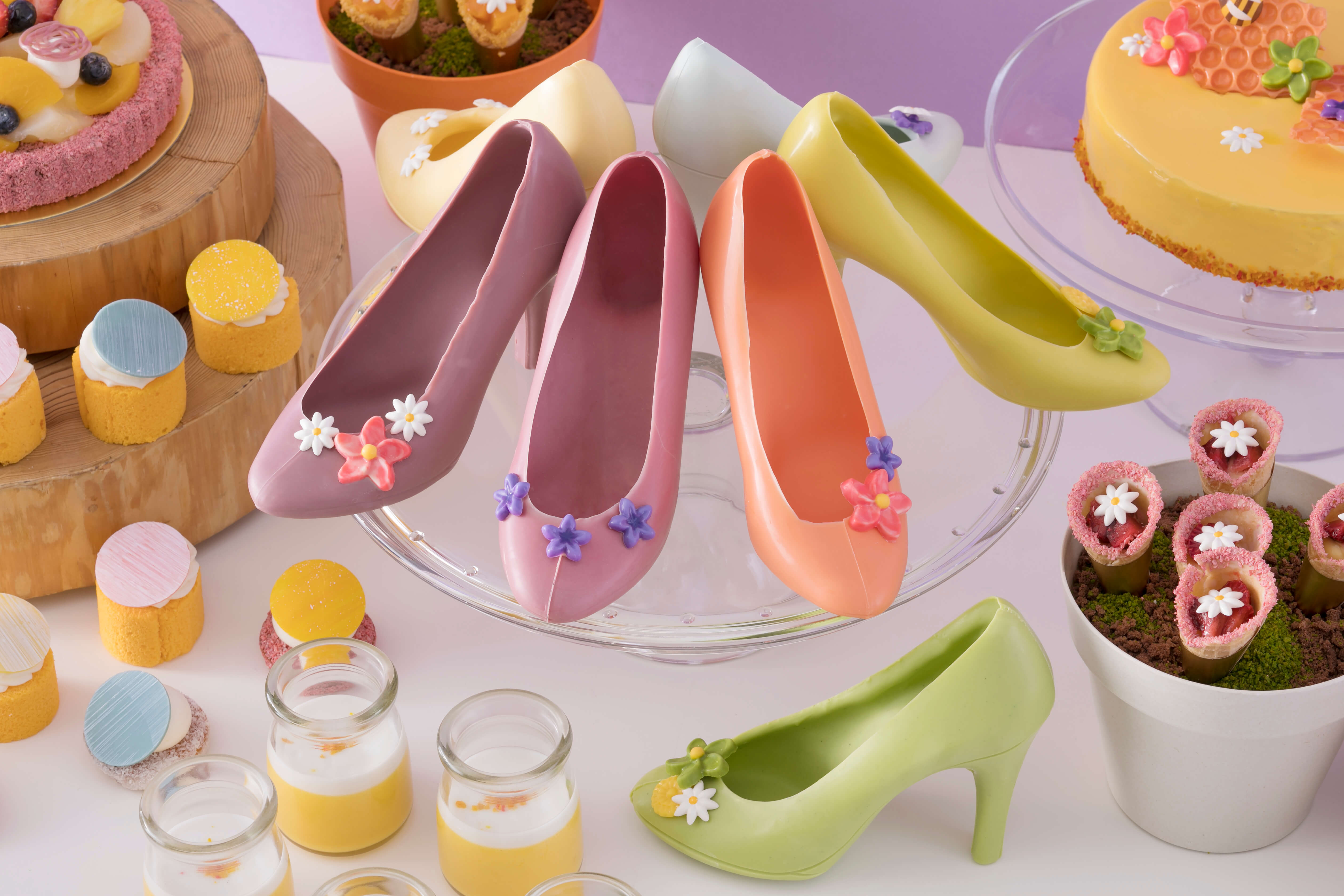 名物のスイスチョコレートファウンテンのレモンカラーや、直径約 15 ㎝のハイヒールチョコレートがタワー で登場するなど、遊び心溢れるカラフルなスイーツたちが約 30 種並びます。カスタードの上に、いちご やマンゴーなど色とりどりのフルーツでデコレーションしたワッフルコーンの植木鉢スイーツも。新元号 「令和」 の慶祝カラー(※)とされる「菫」「梅」の色を使用したスイーツも登場します。初夏にふさわしい “爽やか可愛い”雰囲気を存分にお楽しみください。