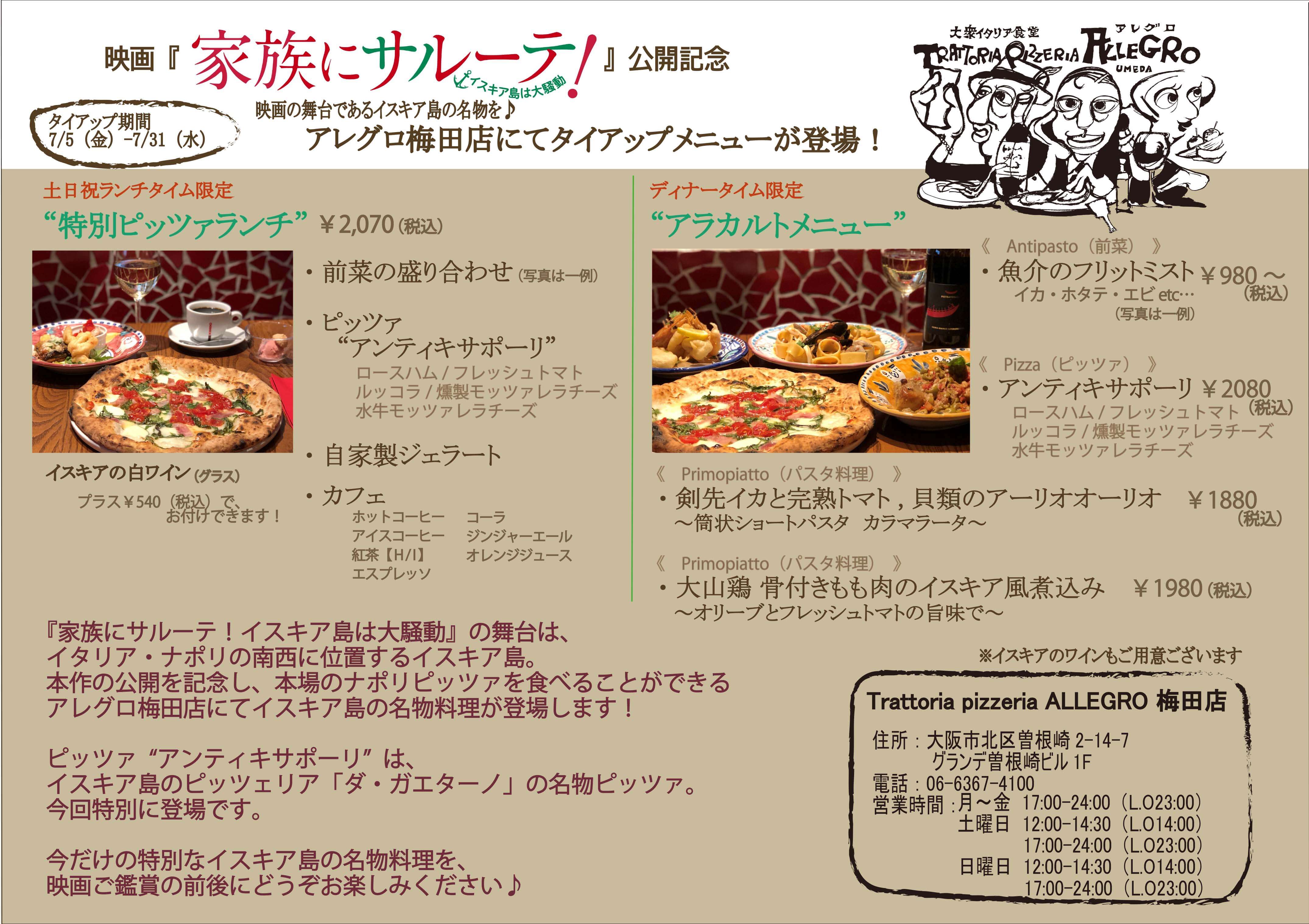 映画『家族にサルーテ!イスキア島は大騒動』の舞台は、イタリア・ナポリの南西に位置するイスキア島。本作の公開を記念し、本場のナポリピッツァを食べることができる大阪の【アレグロ梅田店】にて、イスキア島の名物料理がタイアップメニューとしてたくさん登場!また、イスキア島のワインもお料理と一緒にお楽しみいただけます。店内ではパネル展も開催!!