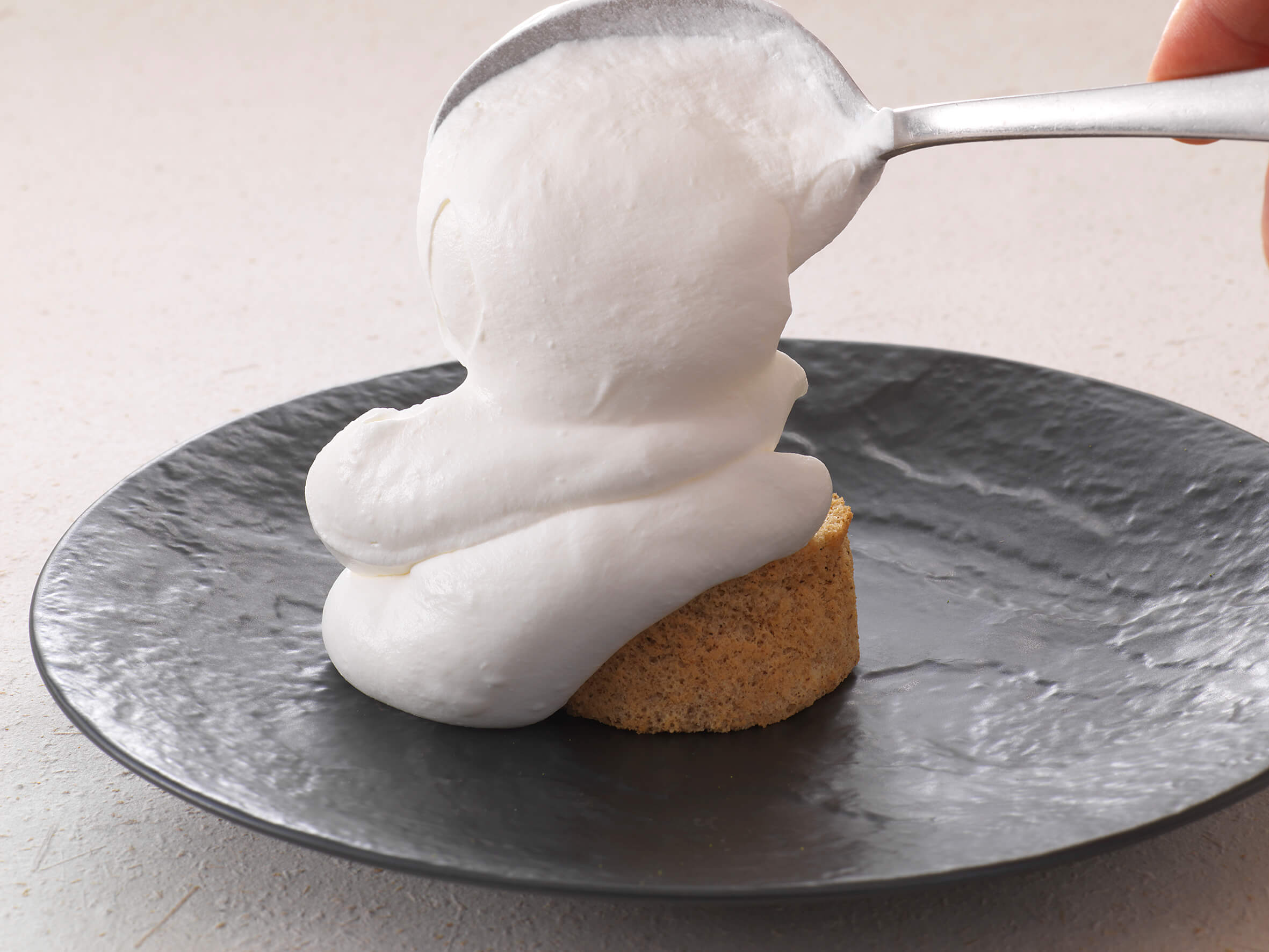 「豆乳ホイップとほうじ茶シフォンケーキ(1名様につき1皿限定)」は、ほうじ茶シフォンケーキにスタッフがお好きな量だけ豆乳ホイップを目の前でおかけします。