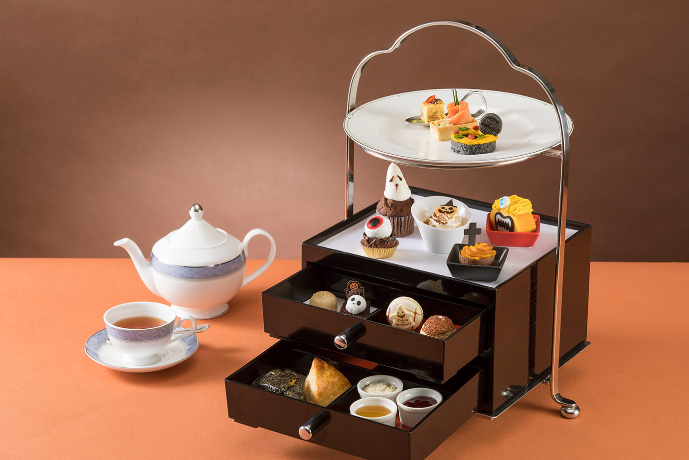 重箱に敷き詰められたアフタヌーンティーセットも、10月はハロウィン仕様に変身。9種のスイーツをモンスターの形をしたロールケーキをはじめ、可愛いおばけ達がスイーツを彩ります。