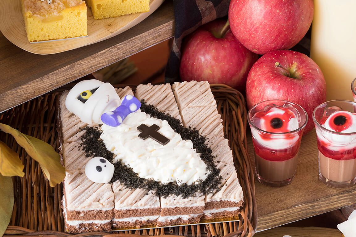 ミイラが寝そべる「モンブランケーキ」に目玉の「パンナコッタ」