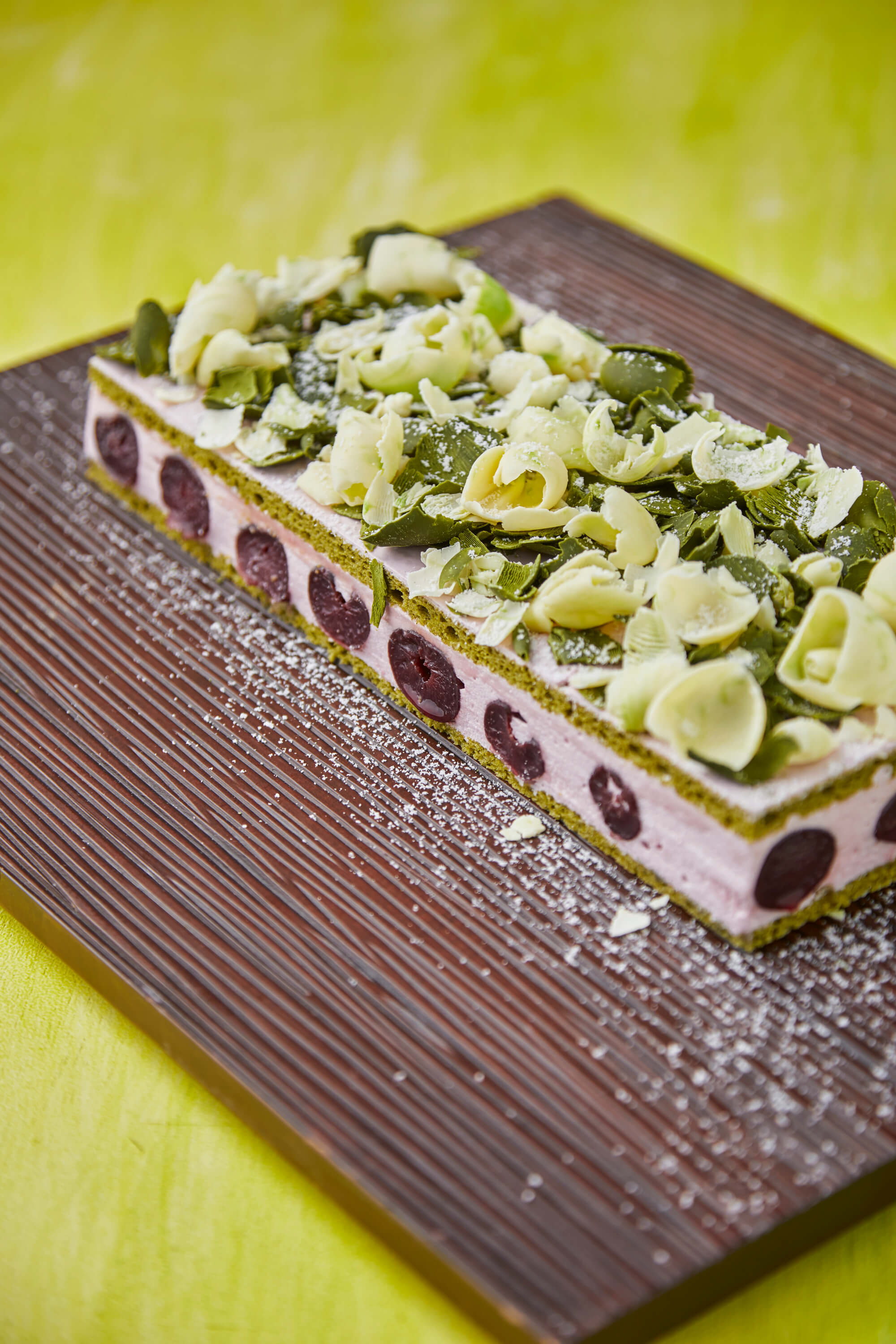 今シーズンの新作であり、シェフのおススメは「抹茶フラワーレス ガトーショコラ」と、「抹茶グリーンフォレスト」。ガトーショコラは、ふんわり感が増してほろっとした口どけの良さに仕上げるため、小麦粉を使用せず、ダイナミックに載せられたトップのふんわりとしたクリームは、抹茶との相性が良く、‘うまみ’アップのため、生クリームの代わりに豆乳クリームを加えました。次にブラックフォレストならぬ、「抹茶グリーンフォレスト」。爽やかな旬のダークチェリーの果肉とたっぷり濃厚な抹茶チョコレートのバランスがクセになりそうな一品です。(写真は抹茶ガトーショコラ)