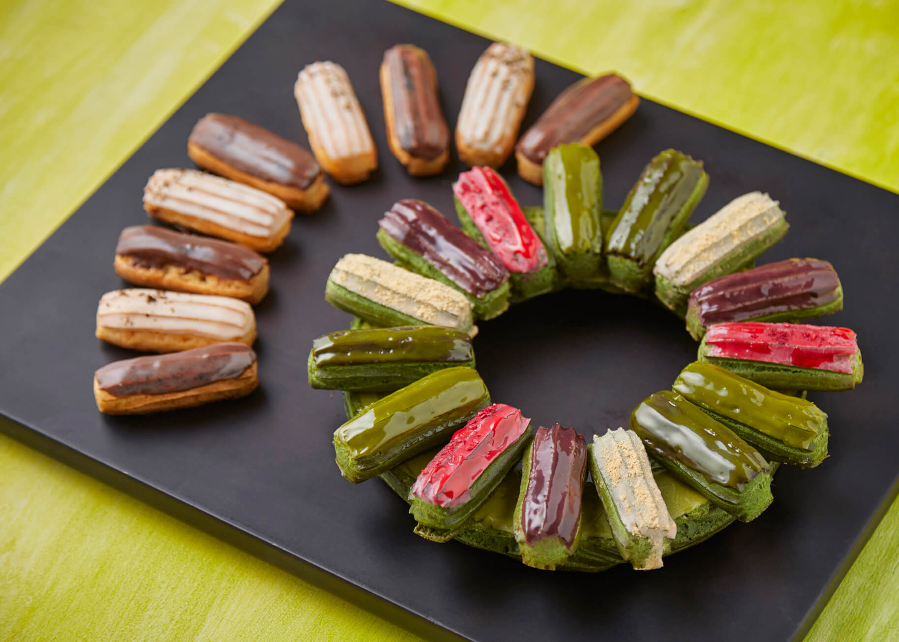 抹茶スイーツブッフェのアイコンとなった「パリブレスト」、今季はなんと抹茶パリブレストに、抹茶・きな粉・小豆・ベリー・ダークチョコレートのミニエクレア・アソートを乗せてデコレーションし、リースの様に仕上げ、上からざくっと切り分けると香りと食感の変化が不思議に楽しめます。