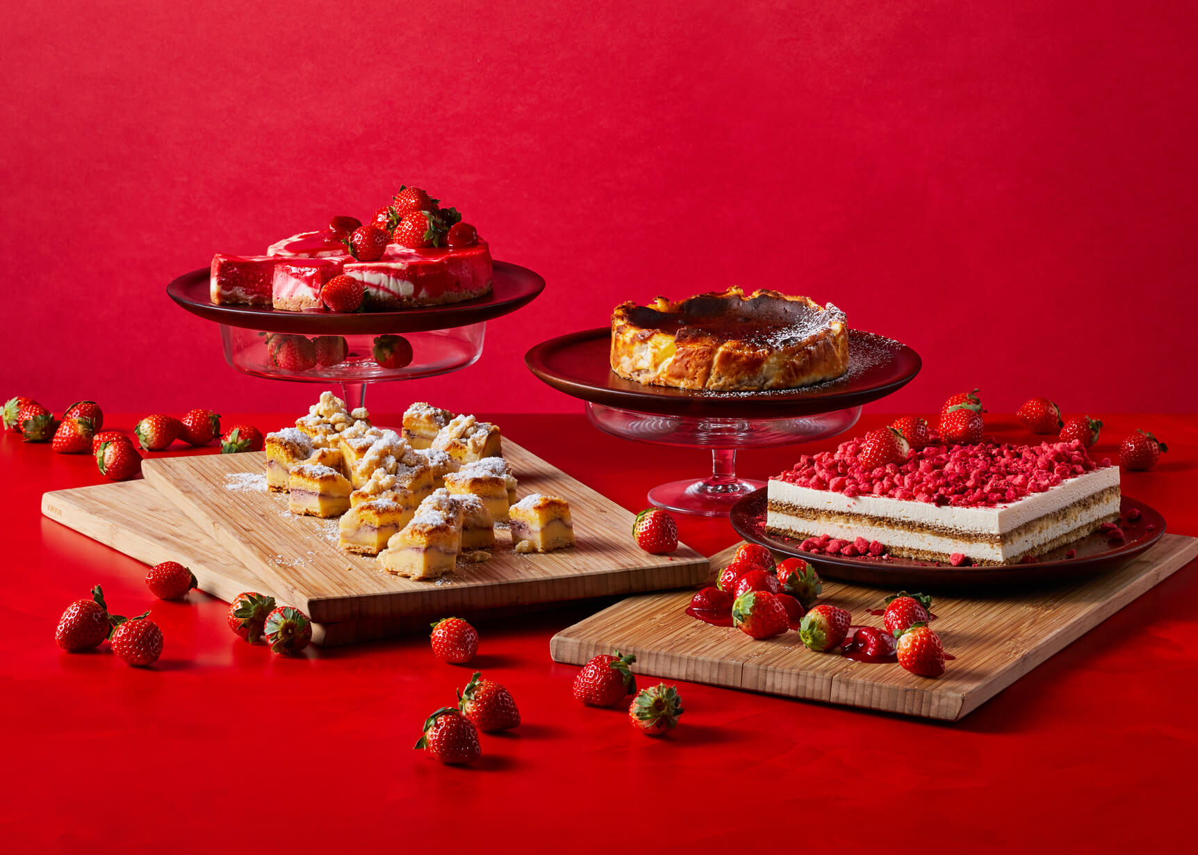 また、チーズスイーツ4種の食べ比べテーブルでは、ドイツ・ドレスデン地方菓子であるベイクドチーズケーキのアイアシェッケをはじめ、長く流行の続くバスクチーズケーキ、ニューヨークチーズケーキ、ティラミスと各国のチーズを使ったケーキを、それぞれ苺とコラボレーションさせたスイーツでご用意。