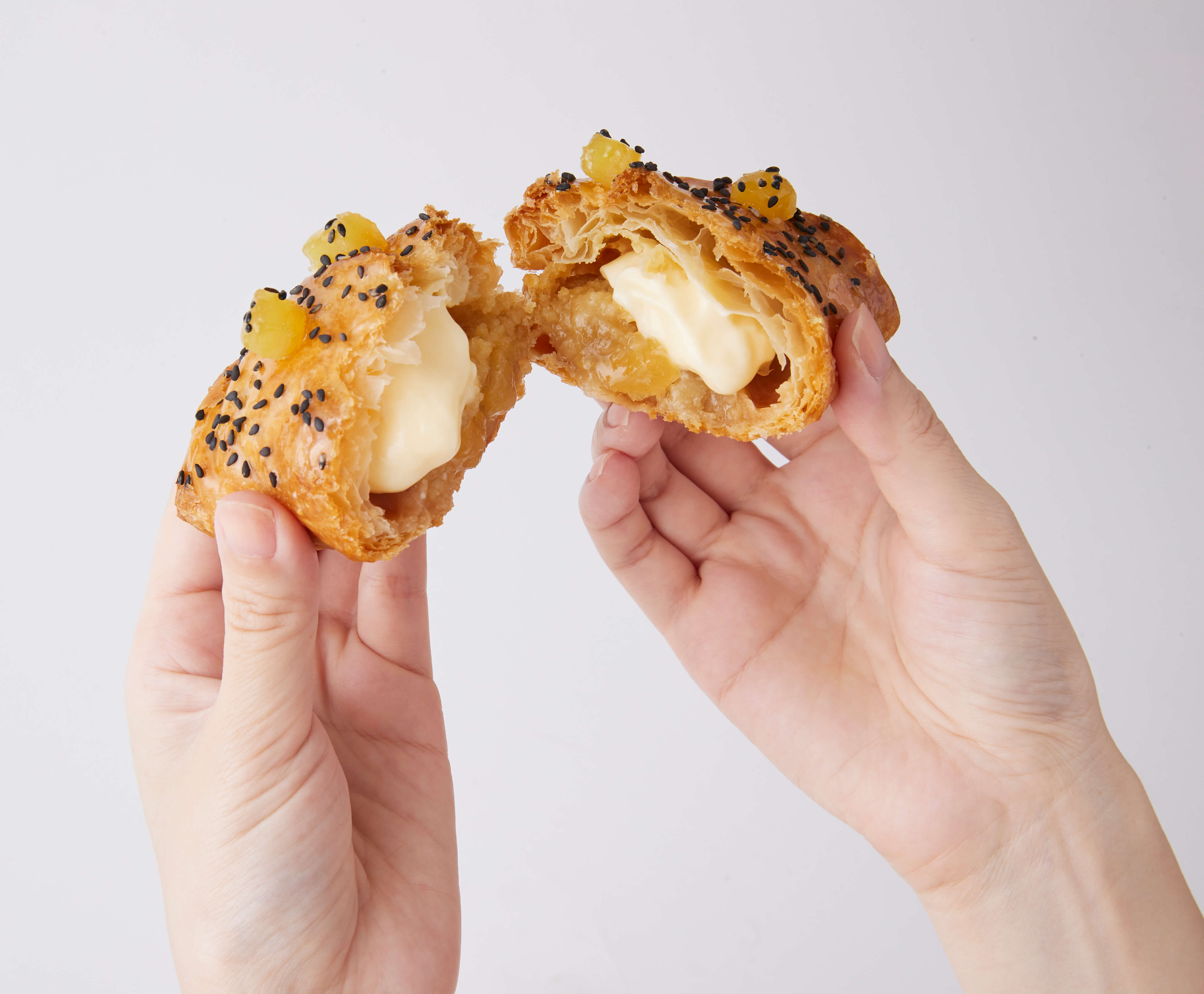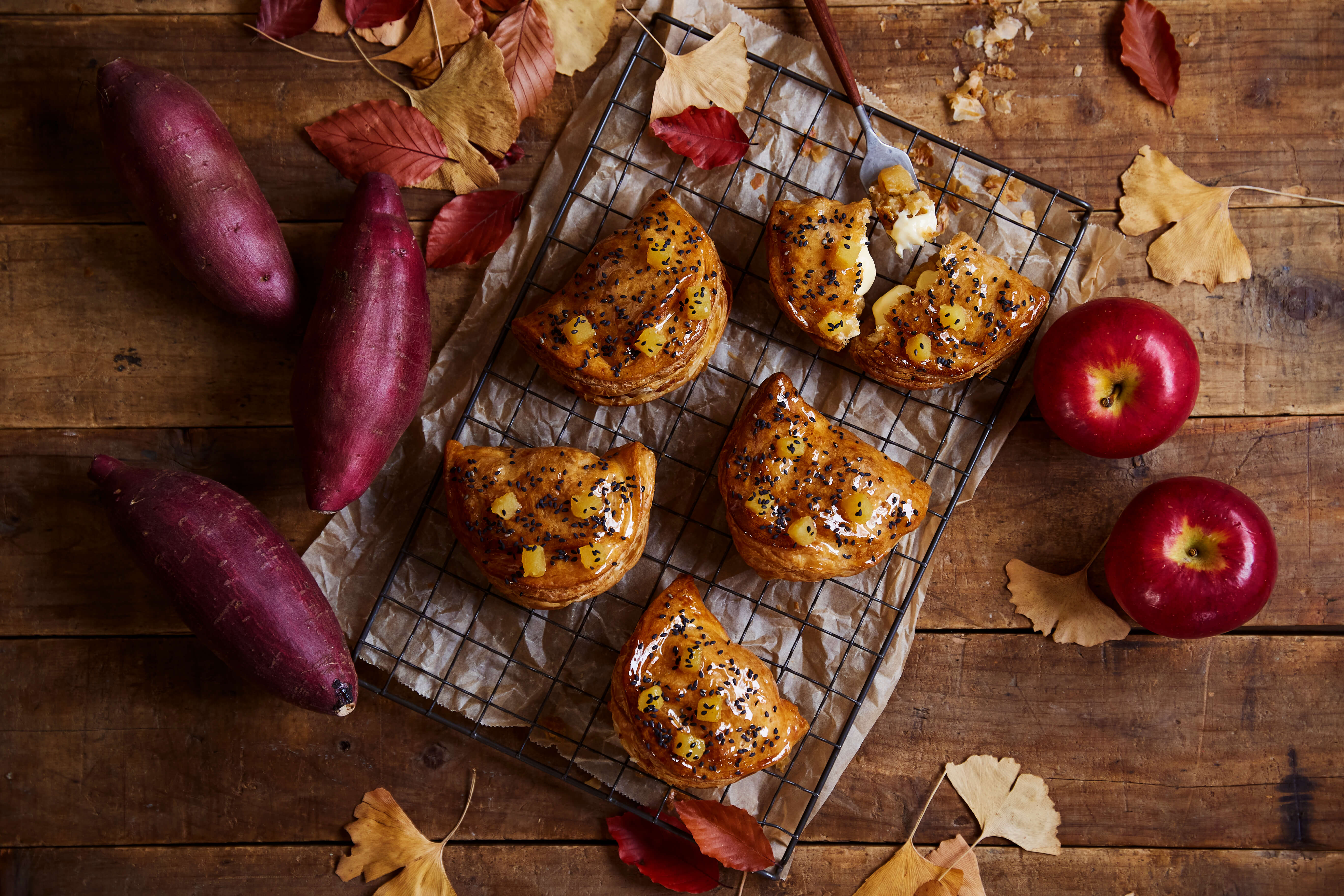 ほっこりとなめらかなお芋ペースト、ゴロッとした食感の 2cm キューブのりんご、トロっとしたカスタードクリームをバランス良く詰め込み、口いっぱいに秋の味覚を楽しんで。