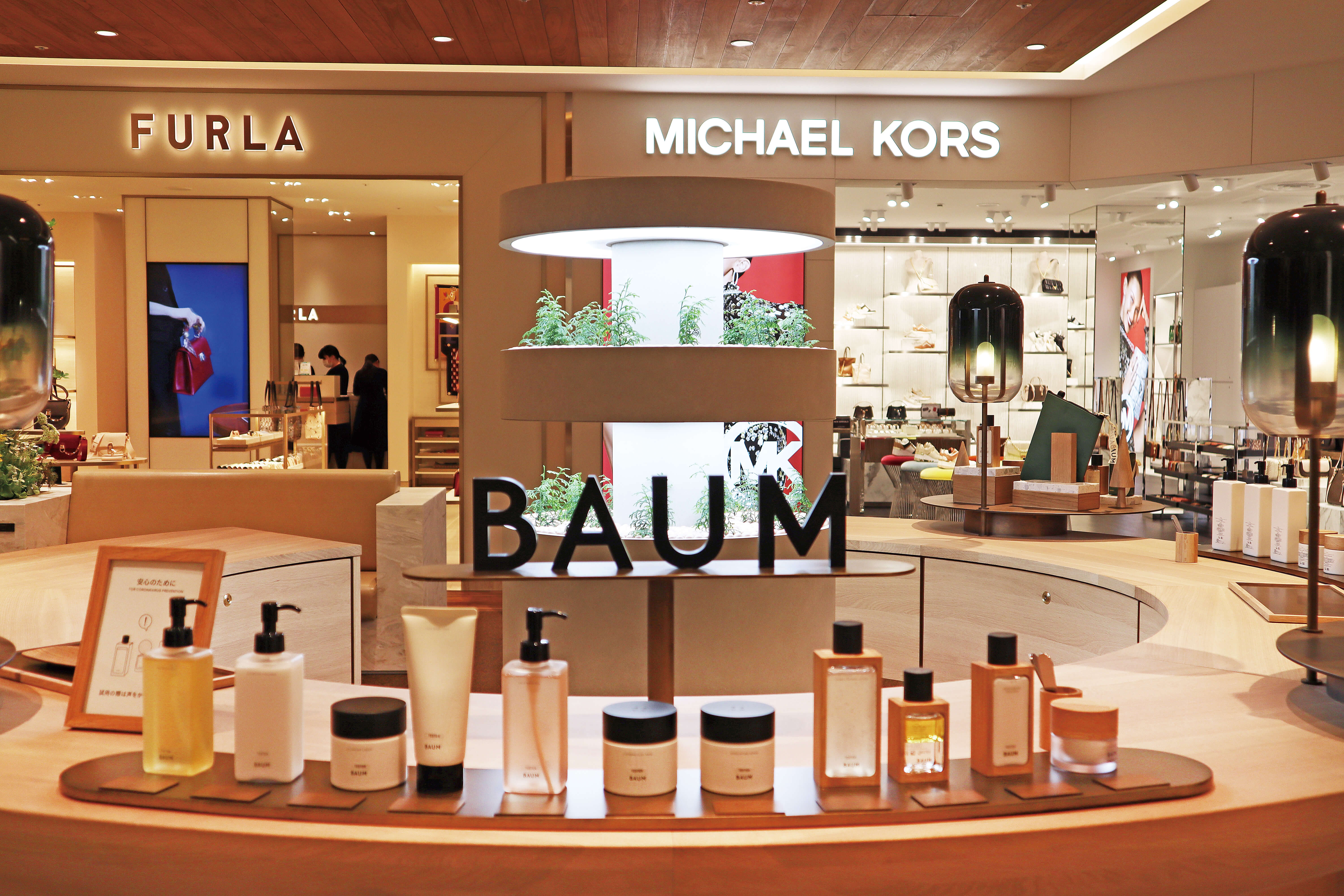 店舗は、お客さまが樹木の恵みと出会う場所。日々の中で、すこやかに美しく生きる本能を感じて英気を養う、止まり木のような存在でありたい。そんな想いから店頭ではクリーンで清々しい森の香りと、心地よい音楽が流れる中、BAUMの商品をゆったりと手にとりお試しいただけます。パルコ心斎橋店は、商品の木枠と同じオーク(ナラ)を用いて制作されたカリモク製の什器を2台設置。お客さま自身のペースで自由にテスターを楽しむことができるセルフトライアルスペースに多方面からアプローチが可能な小型パーチを新しく設置。また、ホリデーシーズンに合わせ、「BAUM FOREST」(バウムの森)をコンセプトにしたホリデーディスプレイを設置し、来店するお客さまのギフト選びもサポートします。