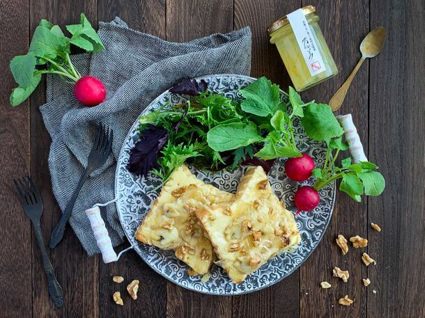 5. 焼き上がったらフライ返しなどでお皿に移し、くるみをトッピングし、レモンマーマレードジャムを上からかける。