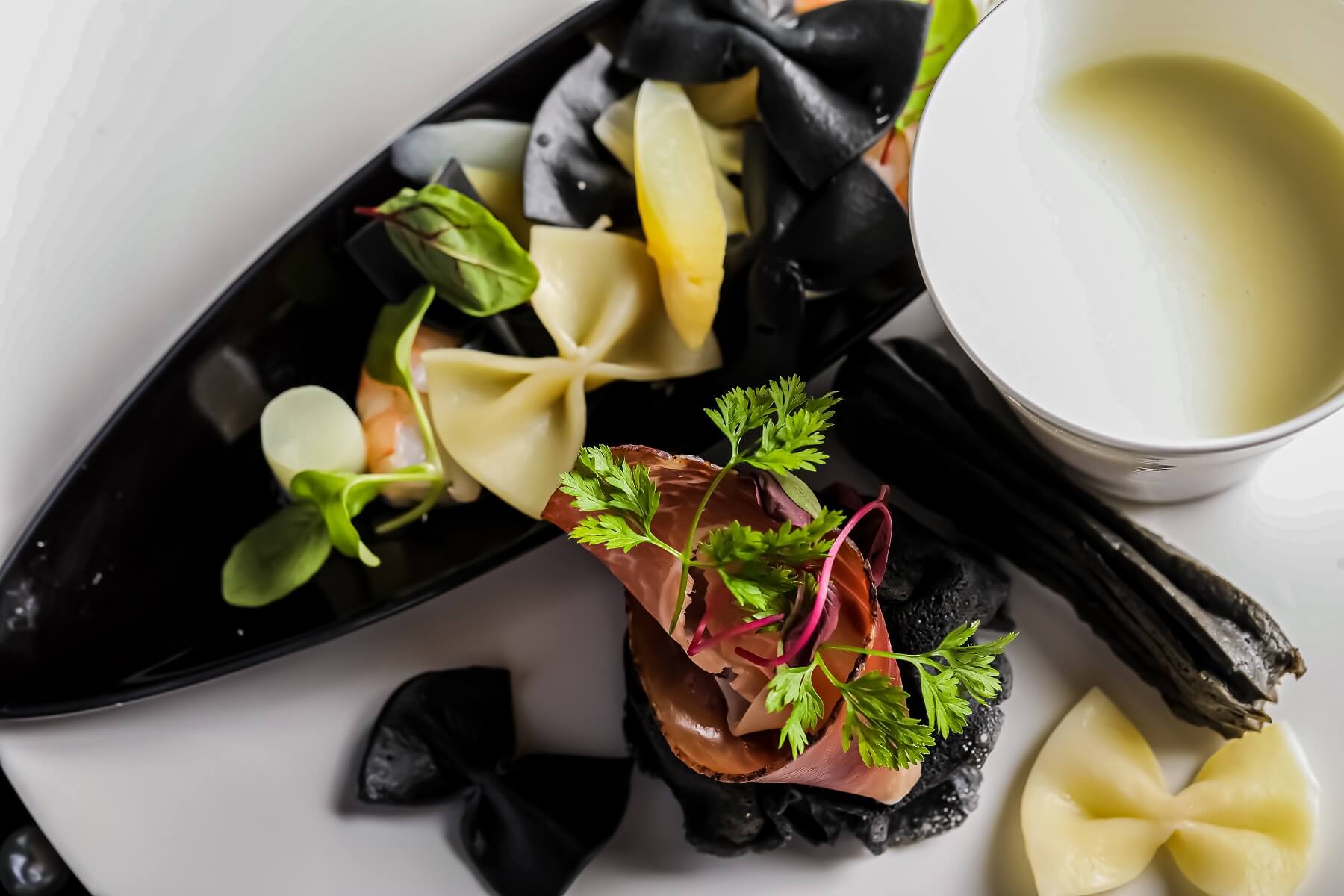 クリームチーズのムースとアボカドのクレープ包み 生ハムのクラウン/モノクロリボンと小海老のパスタサラダ / じゃがいものヴィシソワーズ スパイス香る エクレア