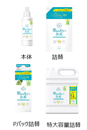 今回のリニューアルにおいては、シリーズを通して香りの研究員が厳選を重ね、「原材料のかすかなニオイ」までこだわり変更することで、限りなく無臭に近づけることを実現。より、お洗たく時も着衣中も香りが気にならないような仕様へと進化。「洗剤」においては、コロナ禍において、菌への意識が高まる中で、パッケージに「植物由来抗菌※1・防臭成分配合」アイコンを追加し、抗菌機能※1を分かりやすく伝えています。「柔軟剤」においては、抗菌剤無添加でありながらも、新たに配合した消臭成分と抗菌※1・防臭効果のある植物由来の柔軟成分によって、部屋干し臭や着衣時のイヤなニオイの発生を防ぎながら、ふんわりやわらかな仕上がりを可能に。