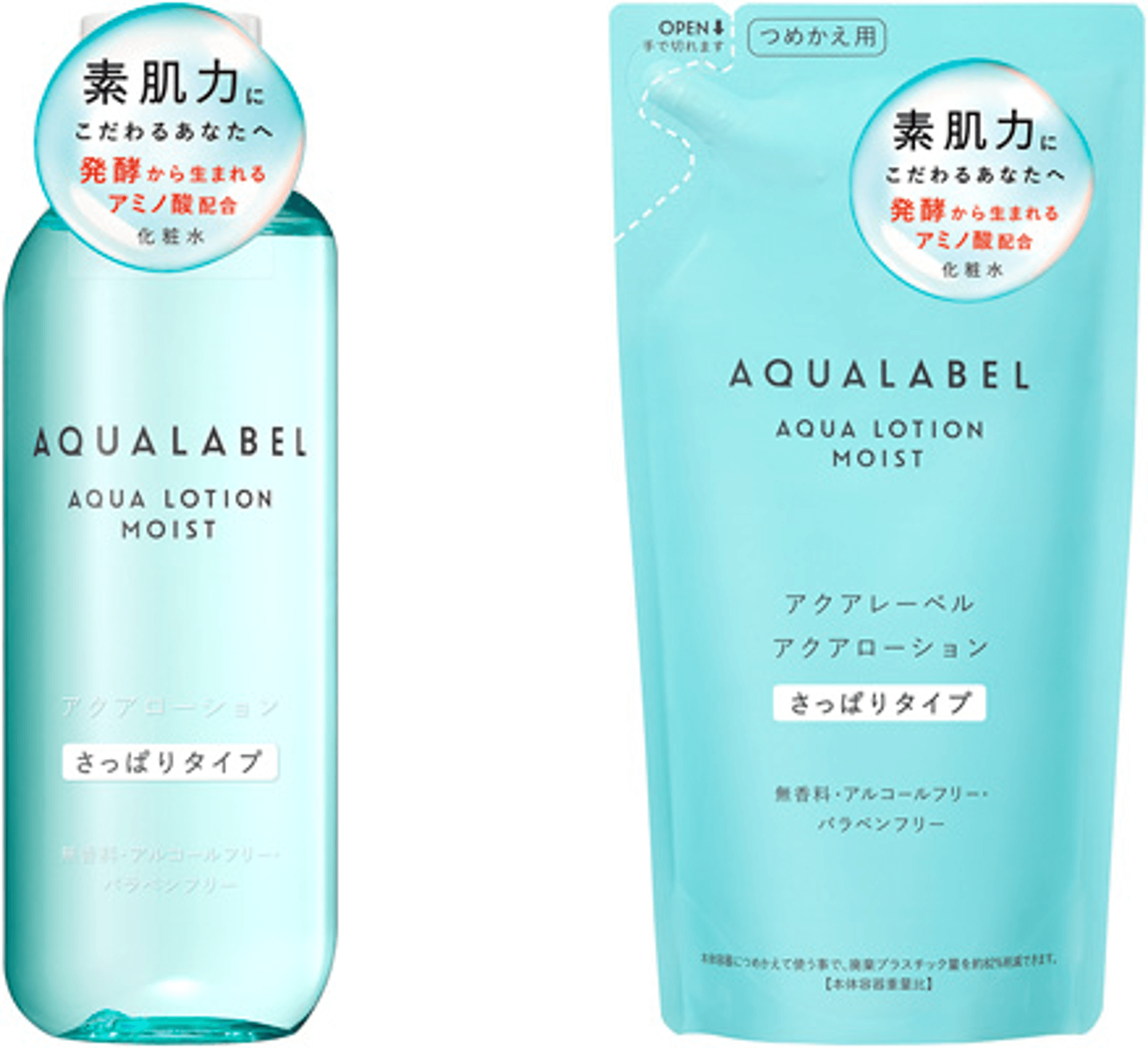 「アクアレーベル アクアローション」は、「バシャバシャ使える:みずみずしさと保湿力を両立させた化粧水。「ツバキ種子発酵エキスGL」※1配合。日本の豊かな四季を代表する植物生まれの「四季の恵みうるおい成分」※2を配合したローションは、長時間うるおいが持続し、うるおった肌へと整えてくれる。テクスチャーは「さっぱり」または「しっとり」からセレクトでき、詰め替え用もあり。