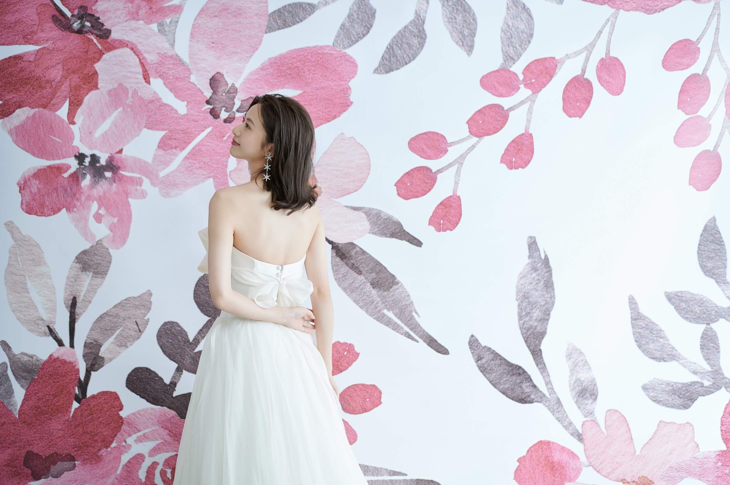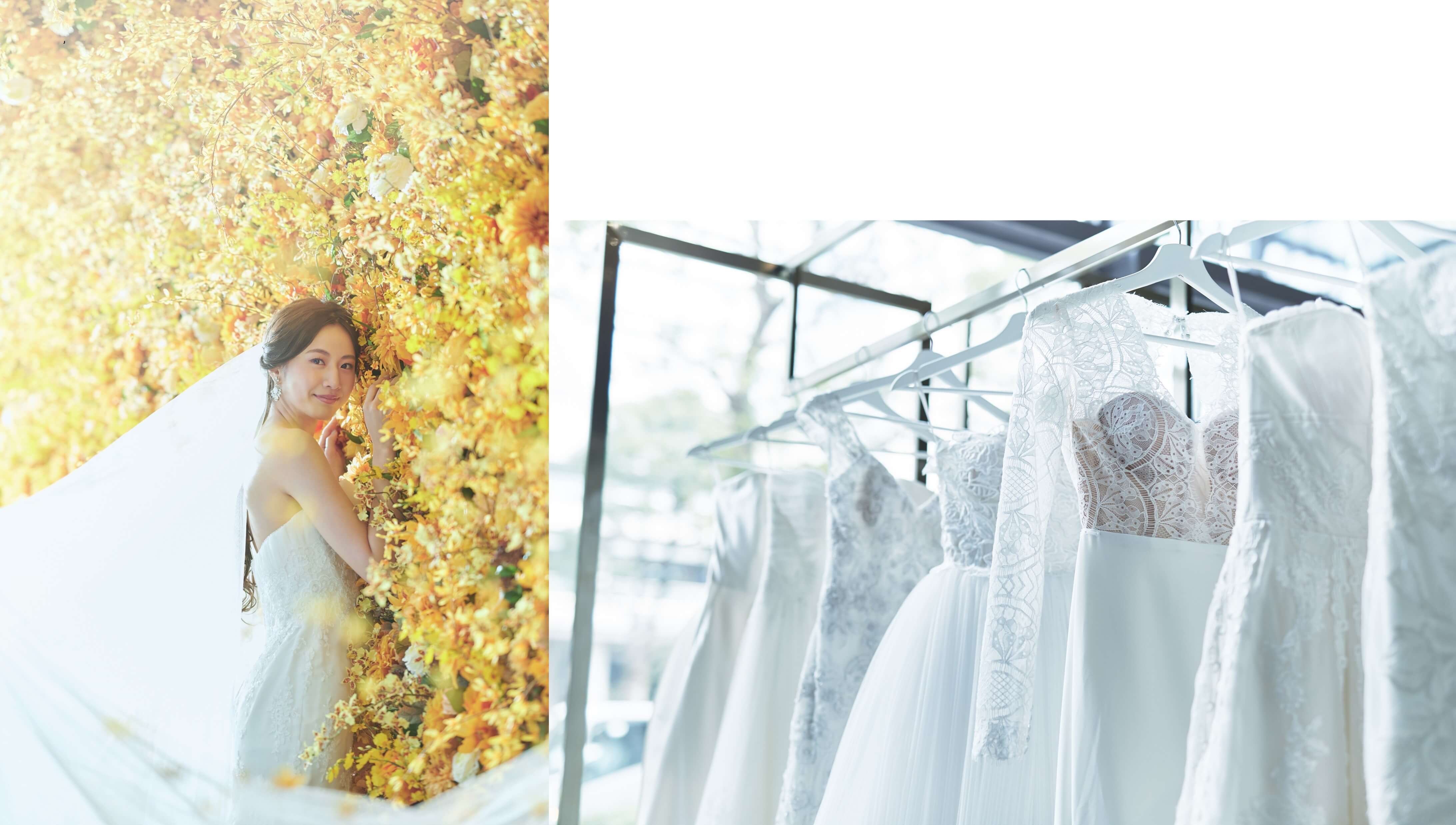 入口には1,000本以上のお花を使用した圧巻のフラワーウォール、スタジオ衣装は時代のニーズにあった旬のドレスからセレクトした数々の衣装がお二人をお出迎えいたします。