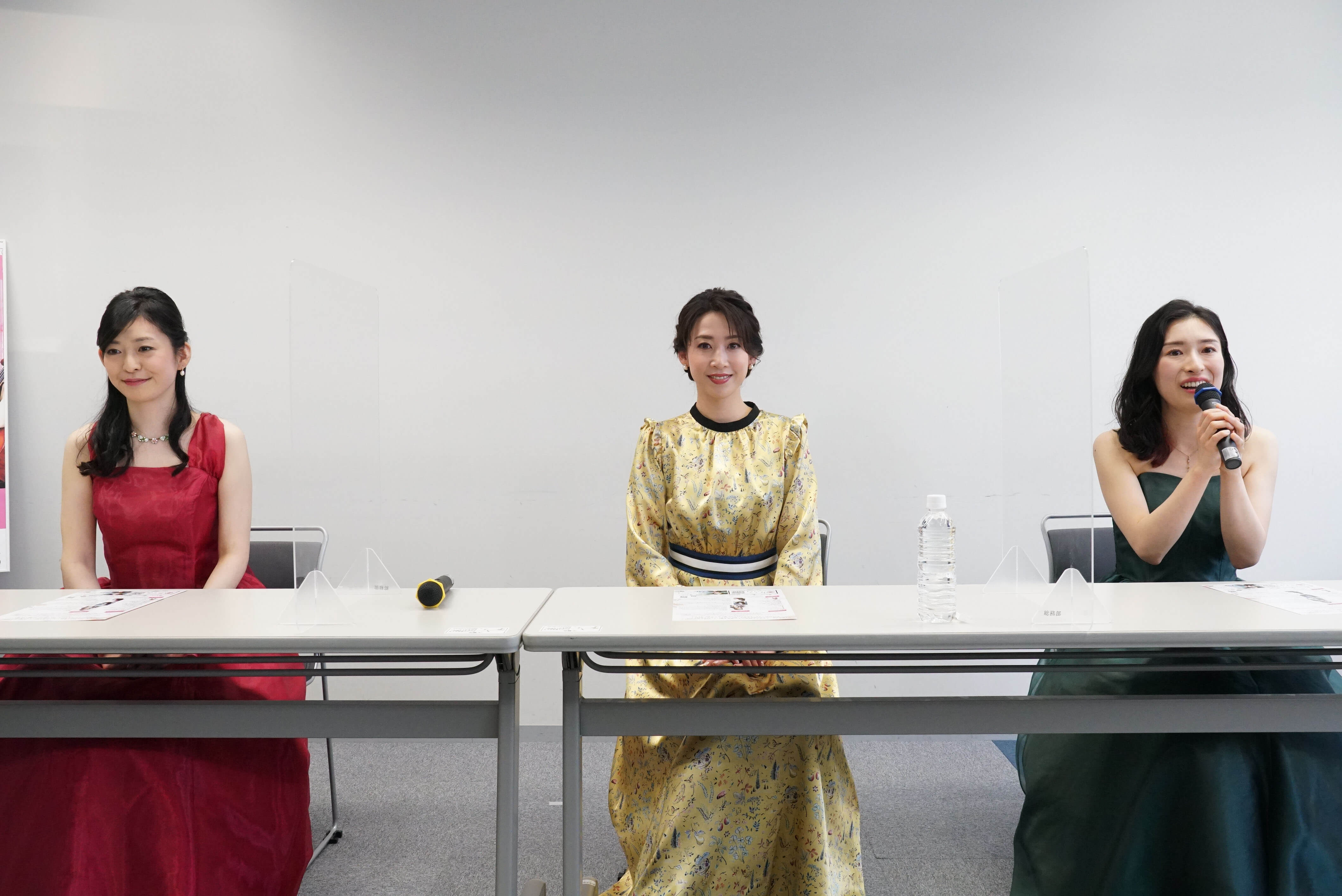 舞台衣装で会見場に入場した龍真咲、林はるか・そよかの3人。その華やかさに記者から拍手が起きました。