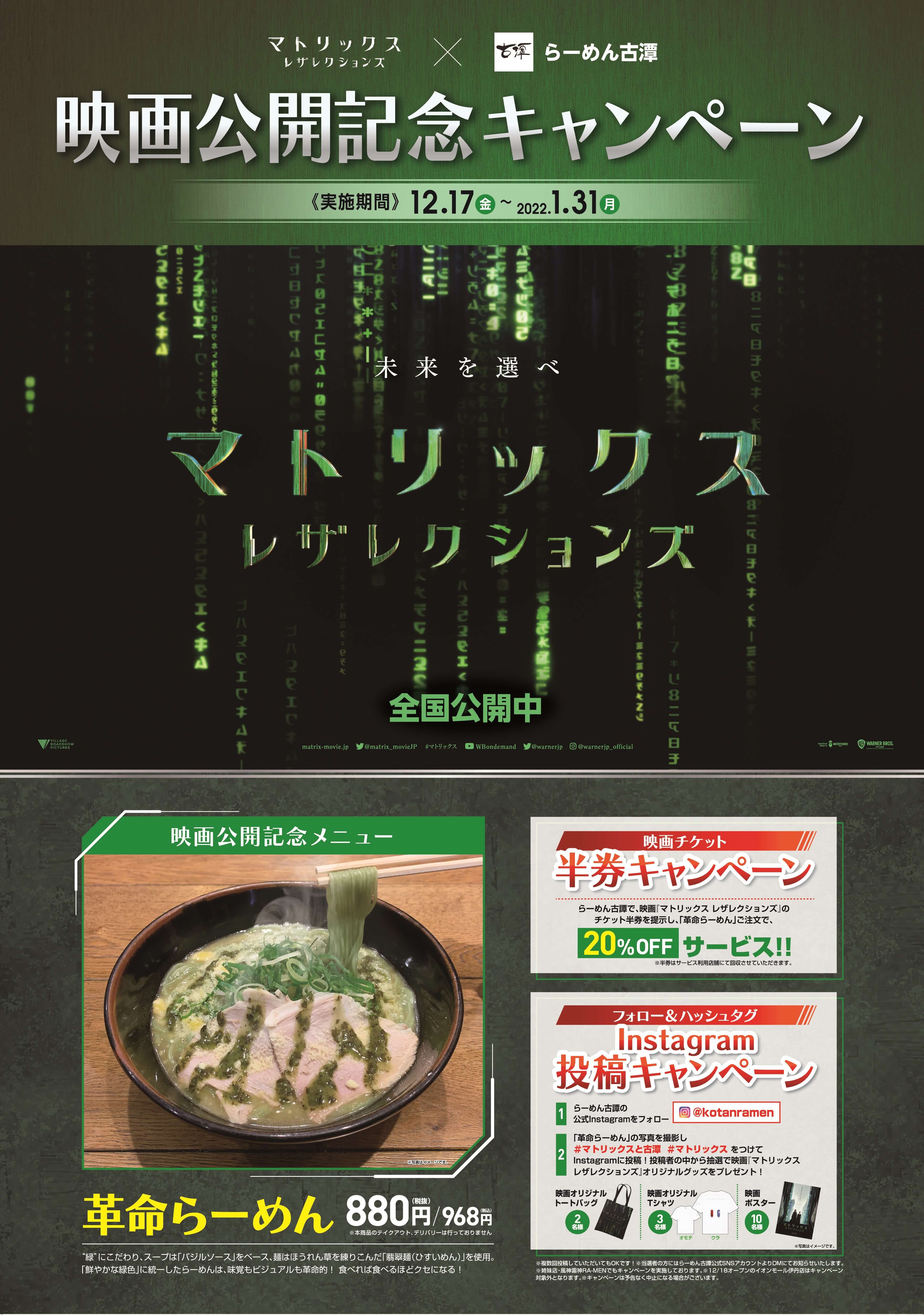 また映画公開記念キャンペーンとして2つのキャンペーンを実施。映画『マトリックス レザレクションズ』の半券を店頭で提示すると「革命らーめん」が20%OFFに! さらに Instagram 投稿キャンペーンでは、「革命らーめん」を注文の上、指定ハッシュタグ#をつけて投稿すると、抽選で映画オリジナルグッズが当たるキャンペーンも実施する。全世界待望の「マトリックス」シリーズの新章である本作を目撃した後は、古潭らーめんでまるで仮想現実かのような革命的一杯を堪能して!