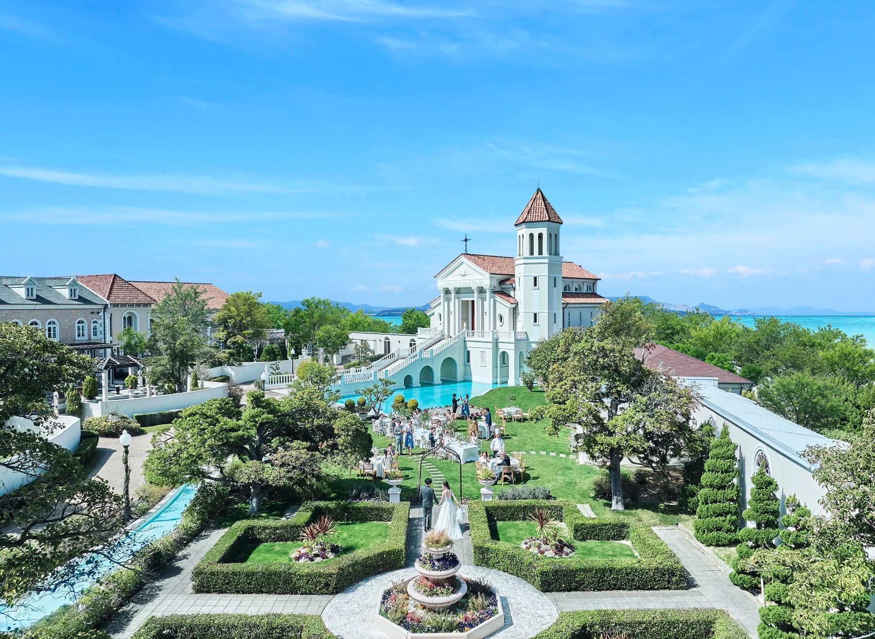 梅田・なんばから約20分。自然溢れる6,000坪のウェディングの街は、招くだけでおもてなしになる上質な空間。広大な敷地には、白亜のチャペルと5つの貸切邸宅が点在。ガーデンやプールのある豪華な洋館に、別荘のようにアットホームな邸宅、風が心地よいテラス付きの少人数用会場。海外リゾートの空気感とともにプライベートウェディングが叶う。