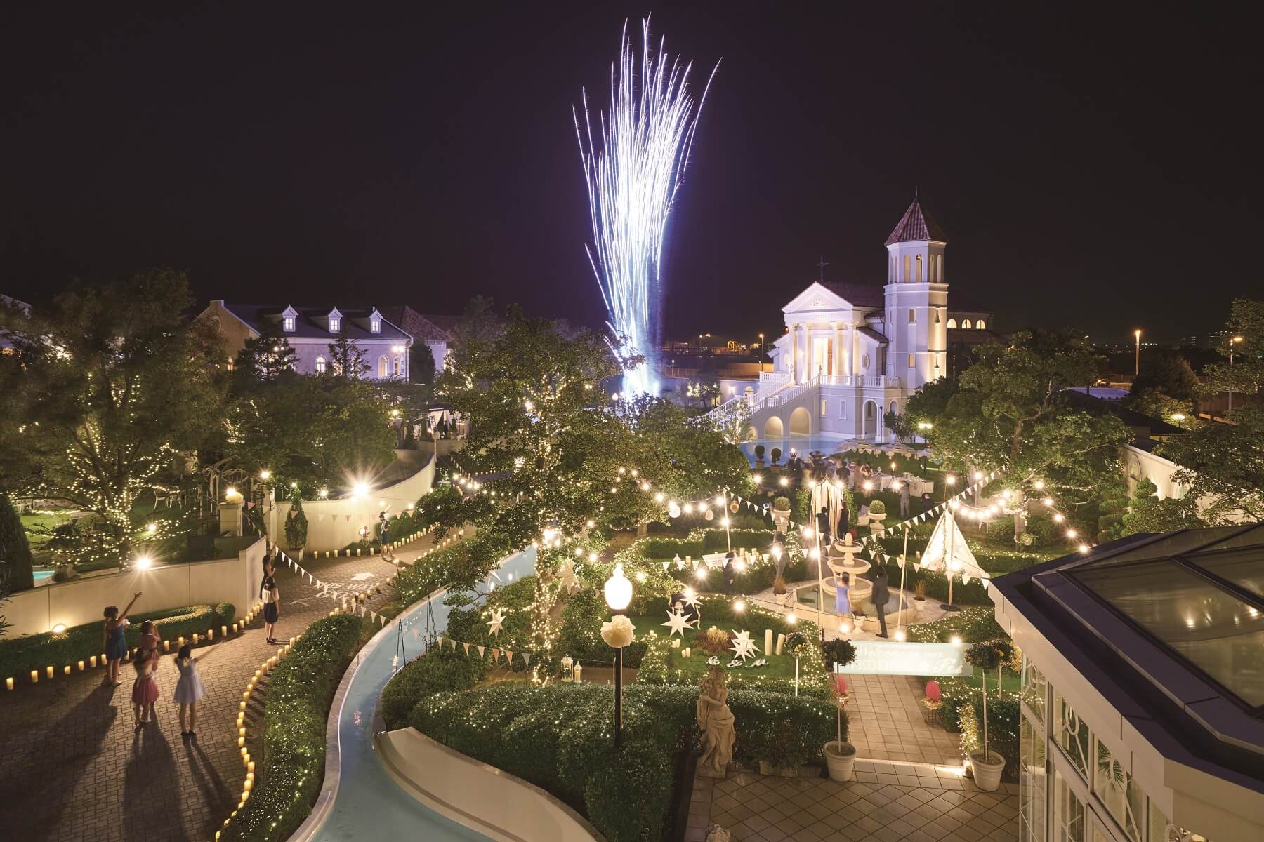 大阪アートグレイスウエディングコーストでは、2022年7月~8月の特定日に『Beer Garden~ラターブルドゥテラス~』と日程限定で『花火Night』を開催。約6000坪の広大な敷地にそびえ立つ荘厳な大聖堂や、キラキラと水辺が輝くプール付きガーデン、調度品に囲まれた豪華な会場などライトアップされた幻想的な空間で、夏の風物詩「ビアガーデン」をお楽しみいただけます。