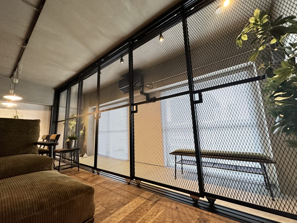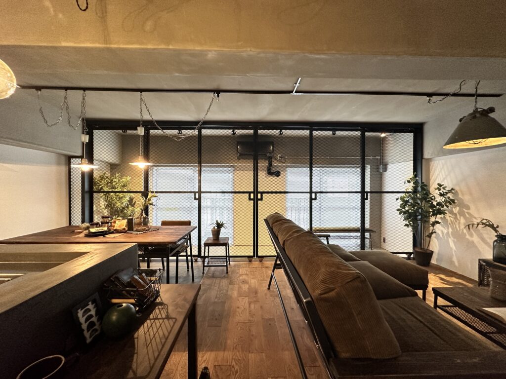 リビング奥にはインナーバルコニーを設置し、特注の大きな鉄の建具を設けました。この鉄建具 の 設置によりインナーバルコニーとリビングが緩やかに区切られ、「INDUSTRIAL BRANCH」の家具がより映える空間となっています。