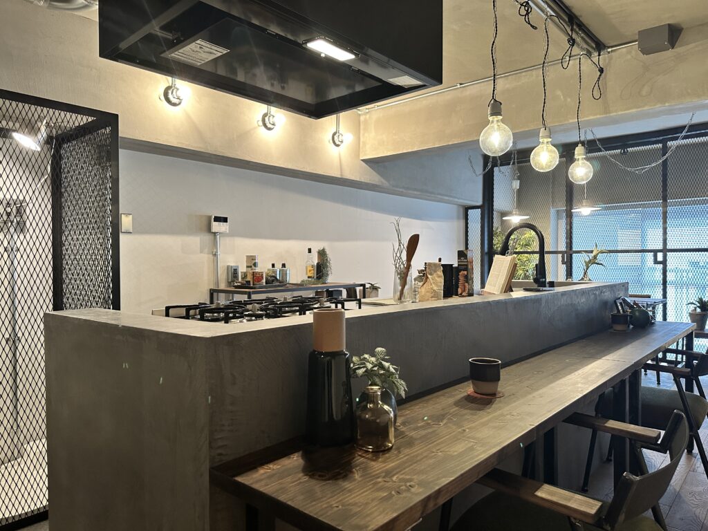 LDK (リビング・ダイニング・キッチン)に入ってすぐ横には、モールテックスを使用した質感豊かな特注造作キッチンを設置しました。深いグレーのモールテックスに黒色の機器類、バイブレーション仕上げのステンレス天板がリビング空間のアクセントになっています。