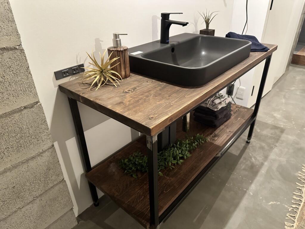 玄関 入ってすぐは 大きな土間 スペースを設け、フレキシブルな使い方ができる空間に仕上げました。その 一角に 「INDUSTRIAL BRANCH」と共同開発したオリジナル洗面台を設置しています。