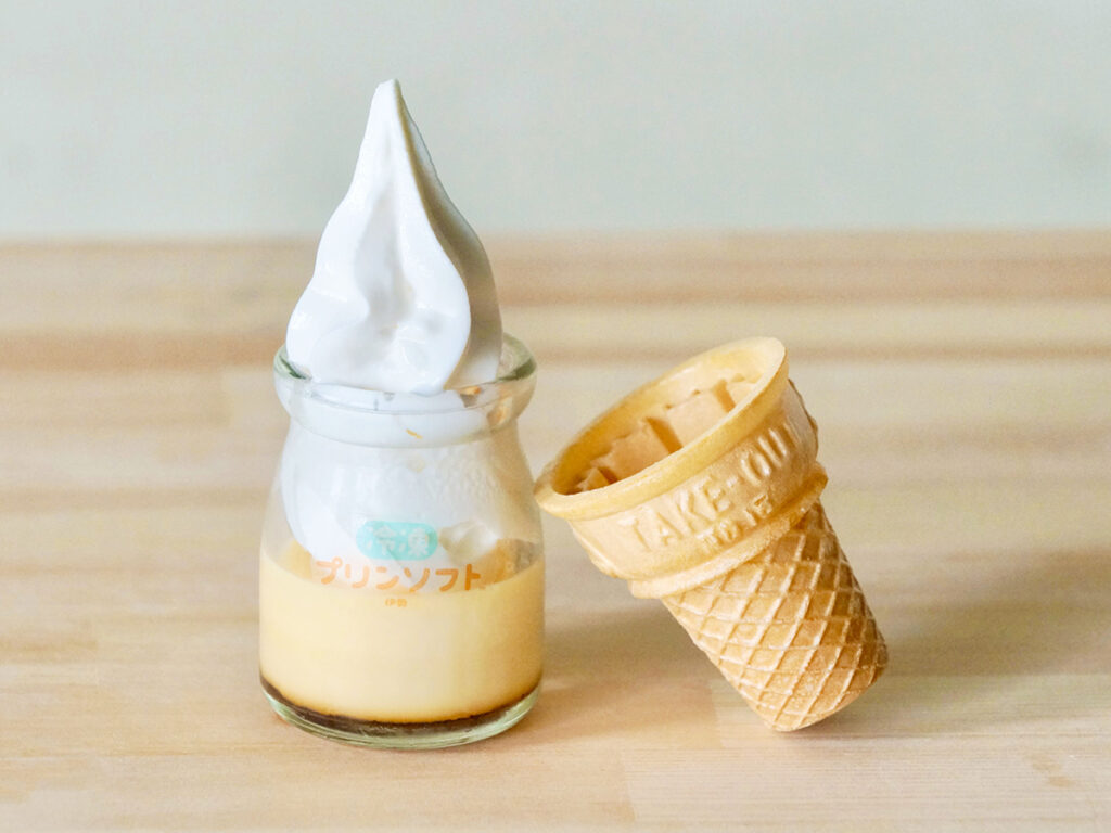 半解凍の新食感プリンが入ったビンに、コク深いソフトクリームを巻きあげました。コーンの帽子をのせるとキュート!今年は実演販売でも登場。