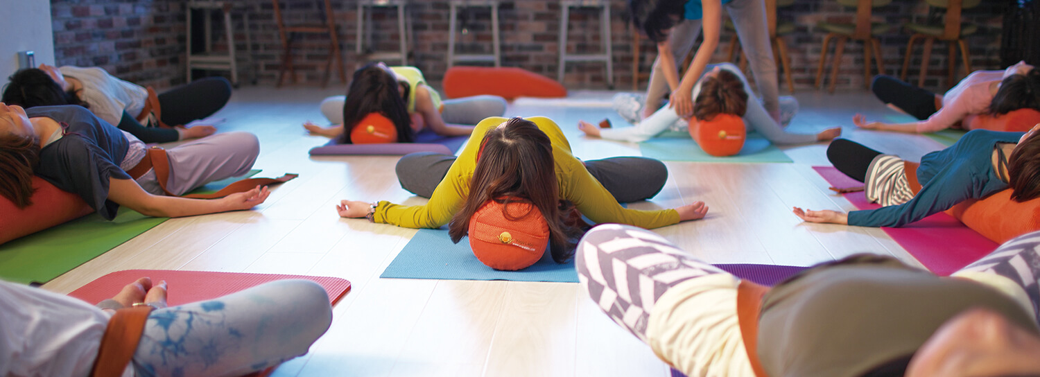 カラダに沿うアングルドボルスターの上に寝ると深い呼吸がラクにできる。
